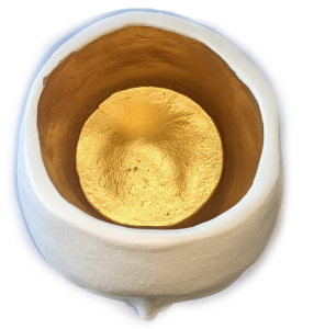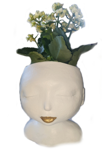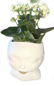 Festlig kruka i form av ett huvud. Vit och guldfärgad. Höjd ca 20 cm, bredd ca 18cm. Material: Resin. (blommorna ingår inte....)