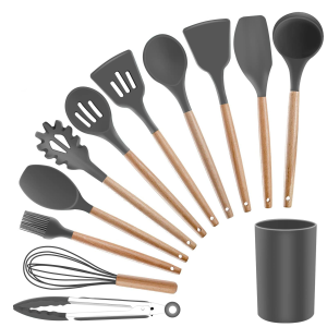 De är tillverkade av matkvalitets silikon med handtag i trä.