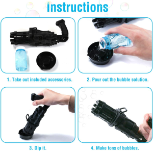 Ladda den med 3 st AA batterier (ingår ej) och häll såpbubblorna i den medföljande skålen. Doppa sen pistolen i skålen för att "ladda" och sen är det bara att köra igång!