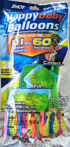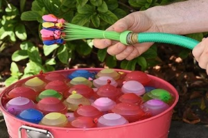 Festliga, färgglada, vattenballonger som är självförslutande. 111 stycken. Kopplas till trädgårdsslangen och ramlar av när dom är fyllda, sen kan vattenkriget börja!