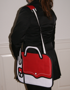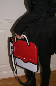 Helt fantastisk väska, ser ut som tagen ur en serietidning. 2-dimensionell men med dragkedjor så man kan veckla ut den och får plats med en hel del. Kommer garanterat att dra uppmärksamhet till sej!