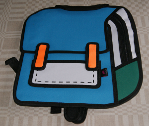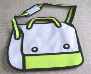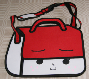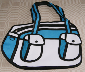 Helt fantastisk väska, ser ut som tagen ur en serietidning. 2-dimensionell men med dragkedjor så man kan veckla ut den och får plats med en hel del. Kommer garanterat att dra uppmärksamhet till sej!