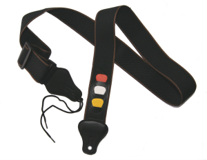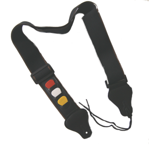 Reglerbart axelband med praktisk plektrumhållare enligt bild. Full längd, ca 140 cm.